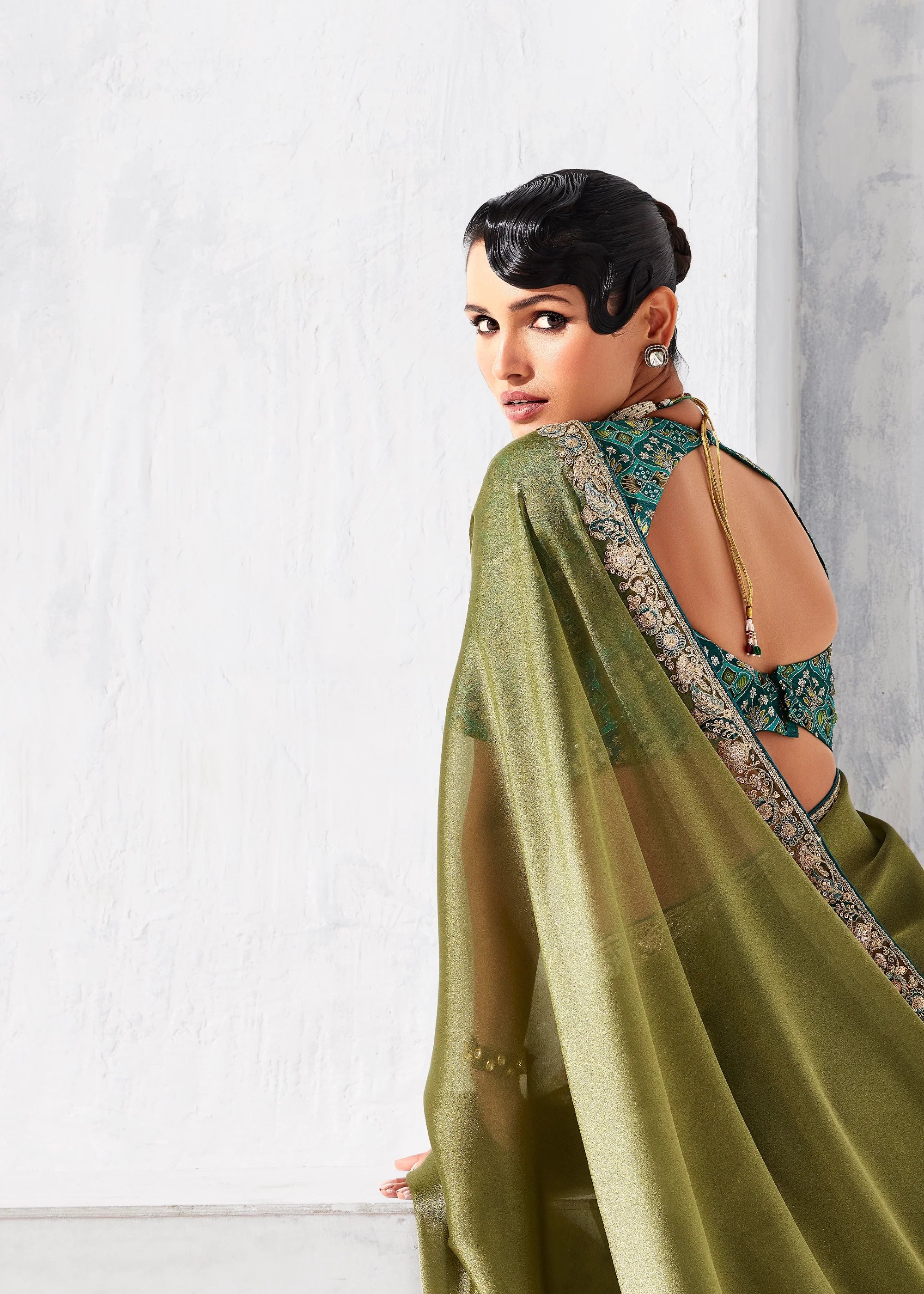 This elegant olive green satin silk saree, with a detailed golden embroidered border and delicate motifs, is perfect for weddings, receptions, or festive occasions, offering a blend of sophistication and charm.