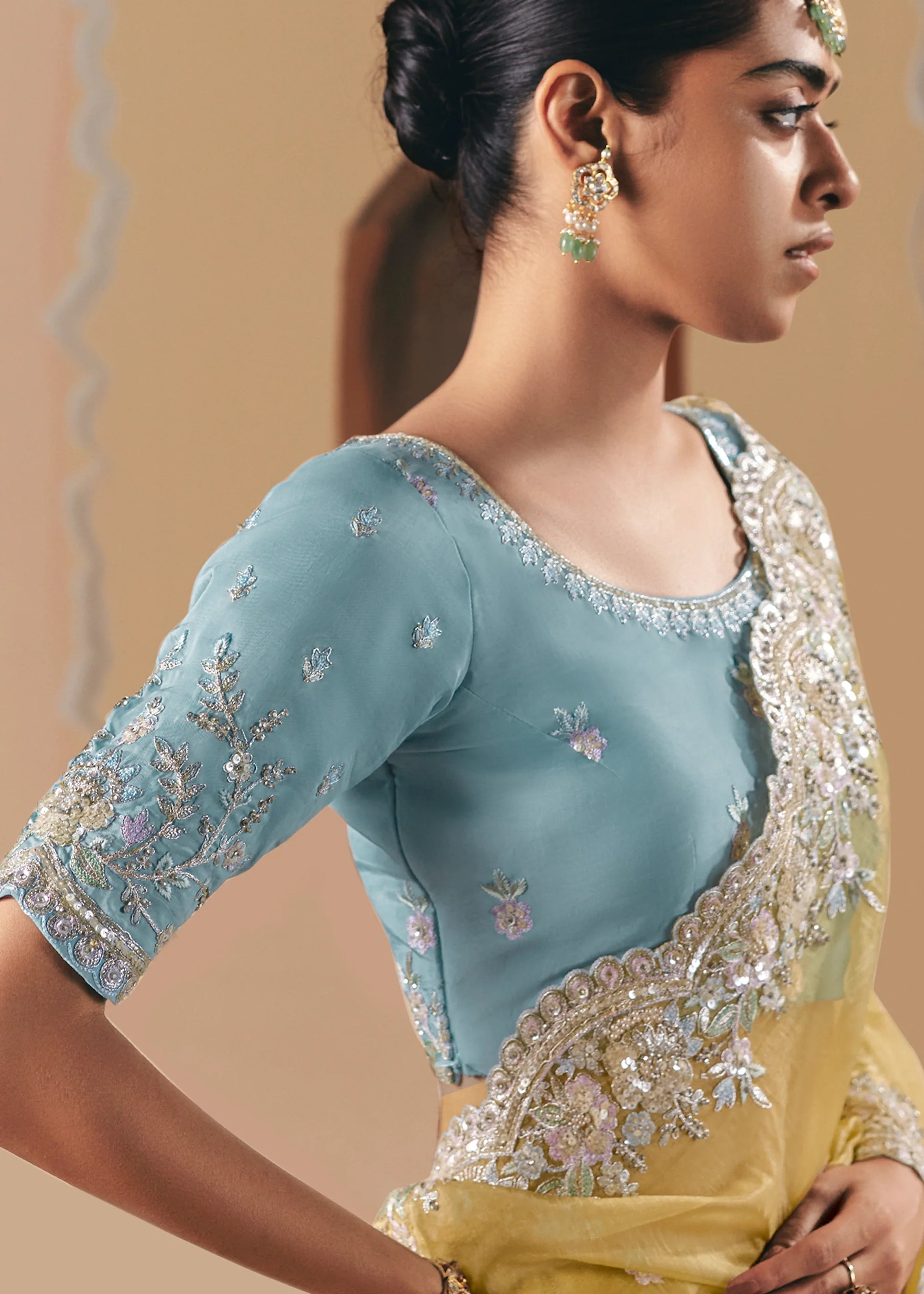This elegant mustard yellow saree features a delicate blend of sequin, moti (pearl), and resham embroidery on a fabric base. It comes with a light blue silk blouse piece, creating a stunning contrast.