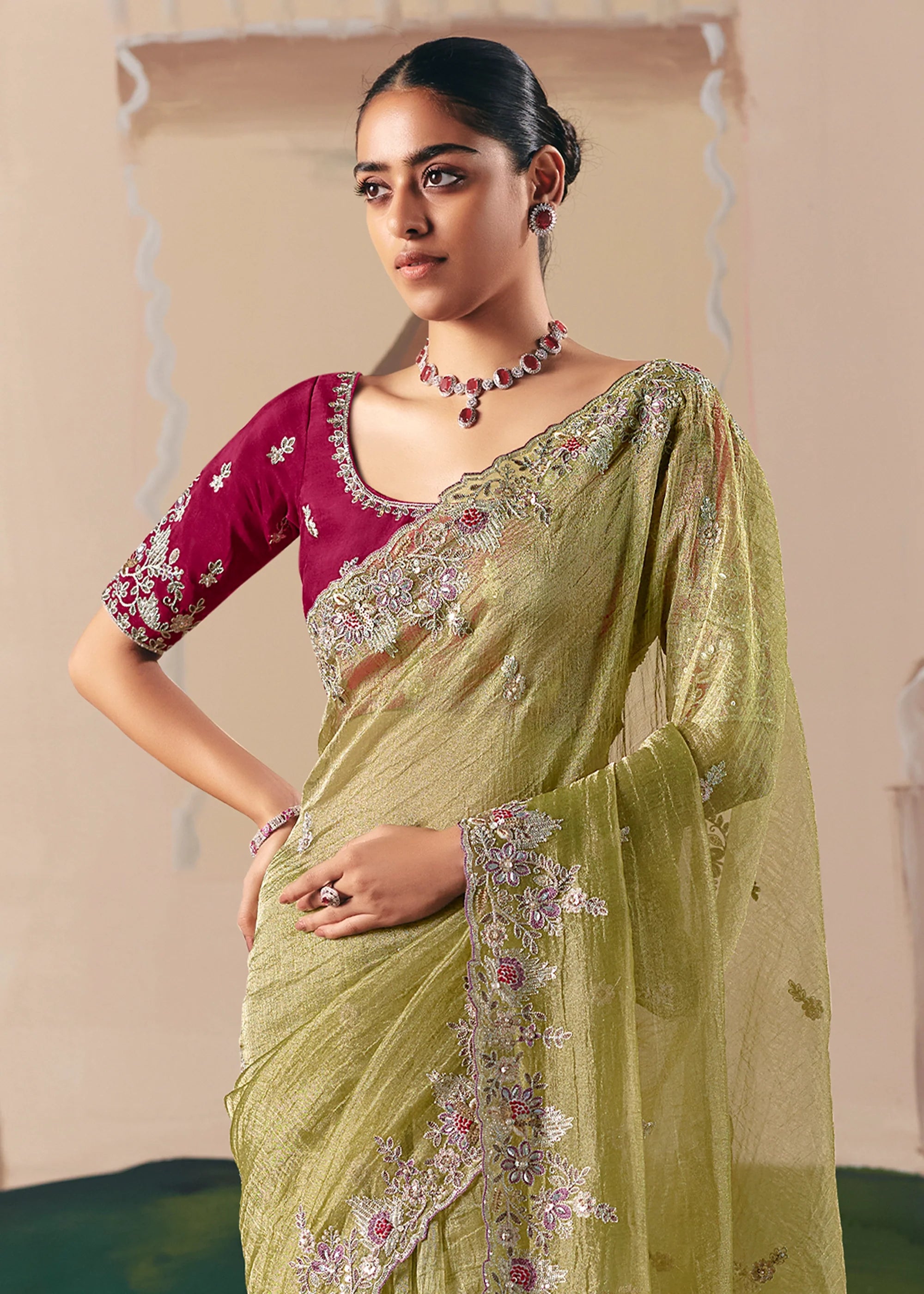This exquisite light green saree, enhanced with intricate resham, sequins, and beads work, is a perfect choice for sangeet, festive evenings, and weddings. It includes a contrasting magenta art silk blouse piece.