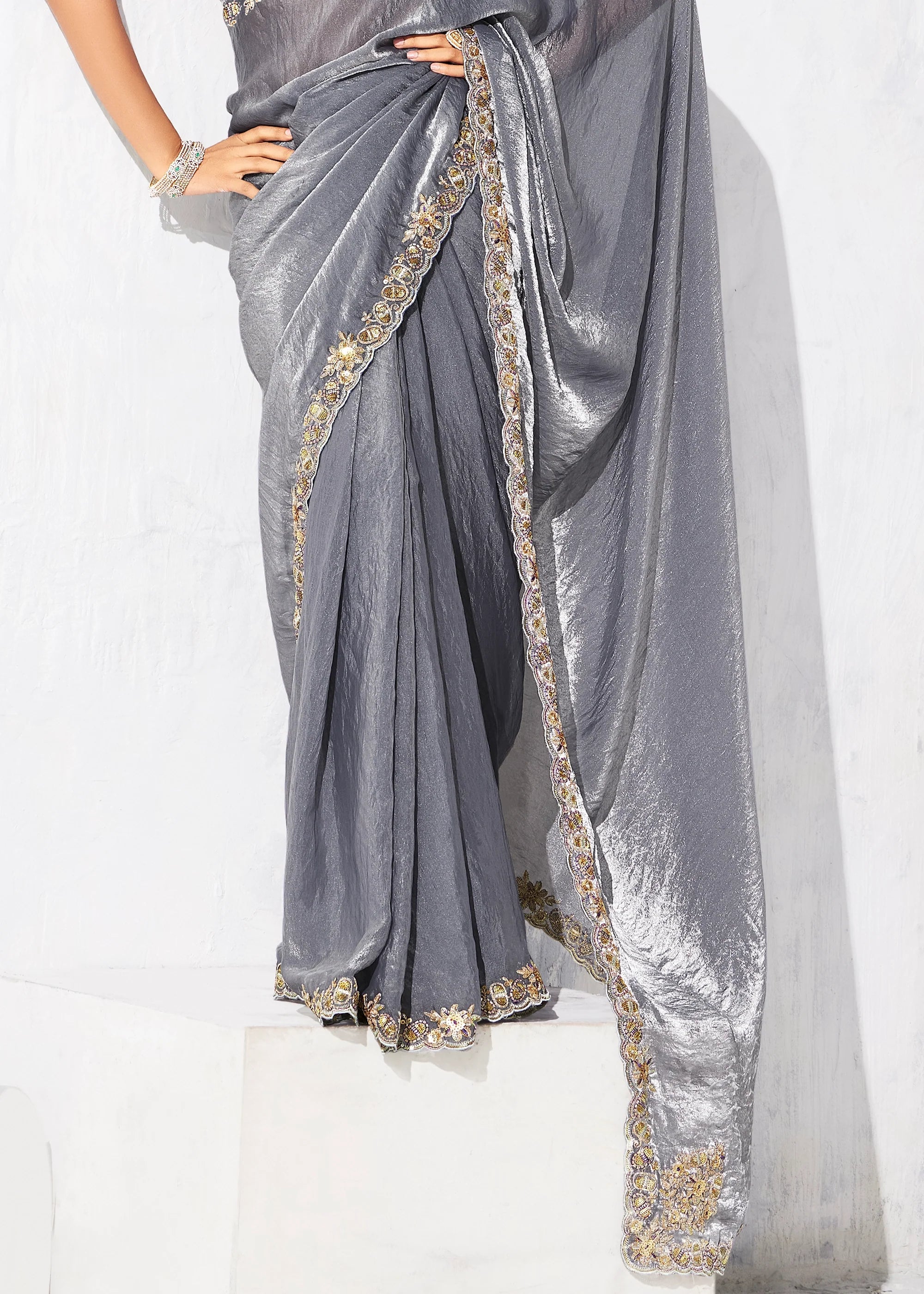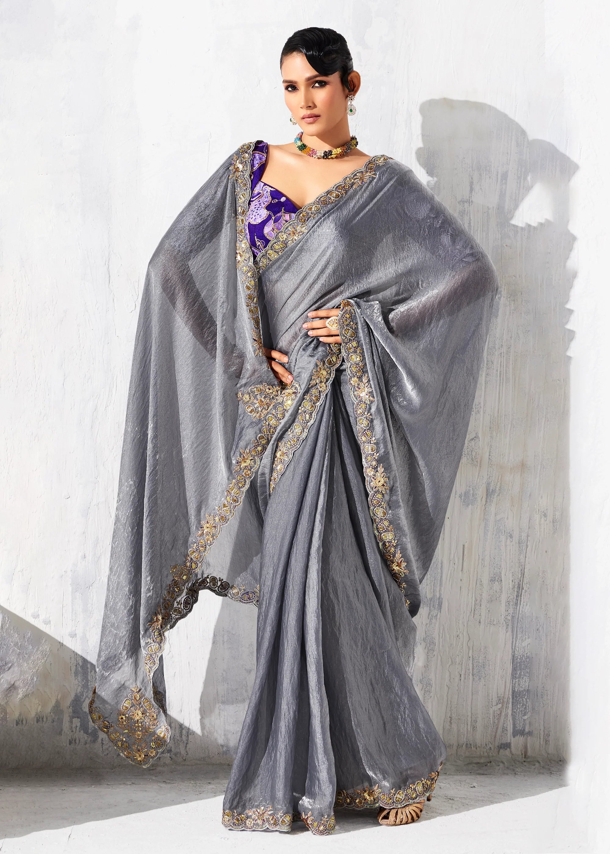 This elegant grey tissue saree, featuring delicate golden embroidered borders, is a perfect party wear choice. It comes paired with a stunning purple blouse with floral threadwork. This ensemble offers a refined, sophisticated look for any event.