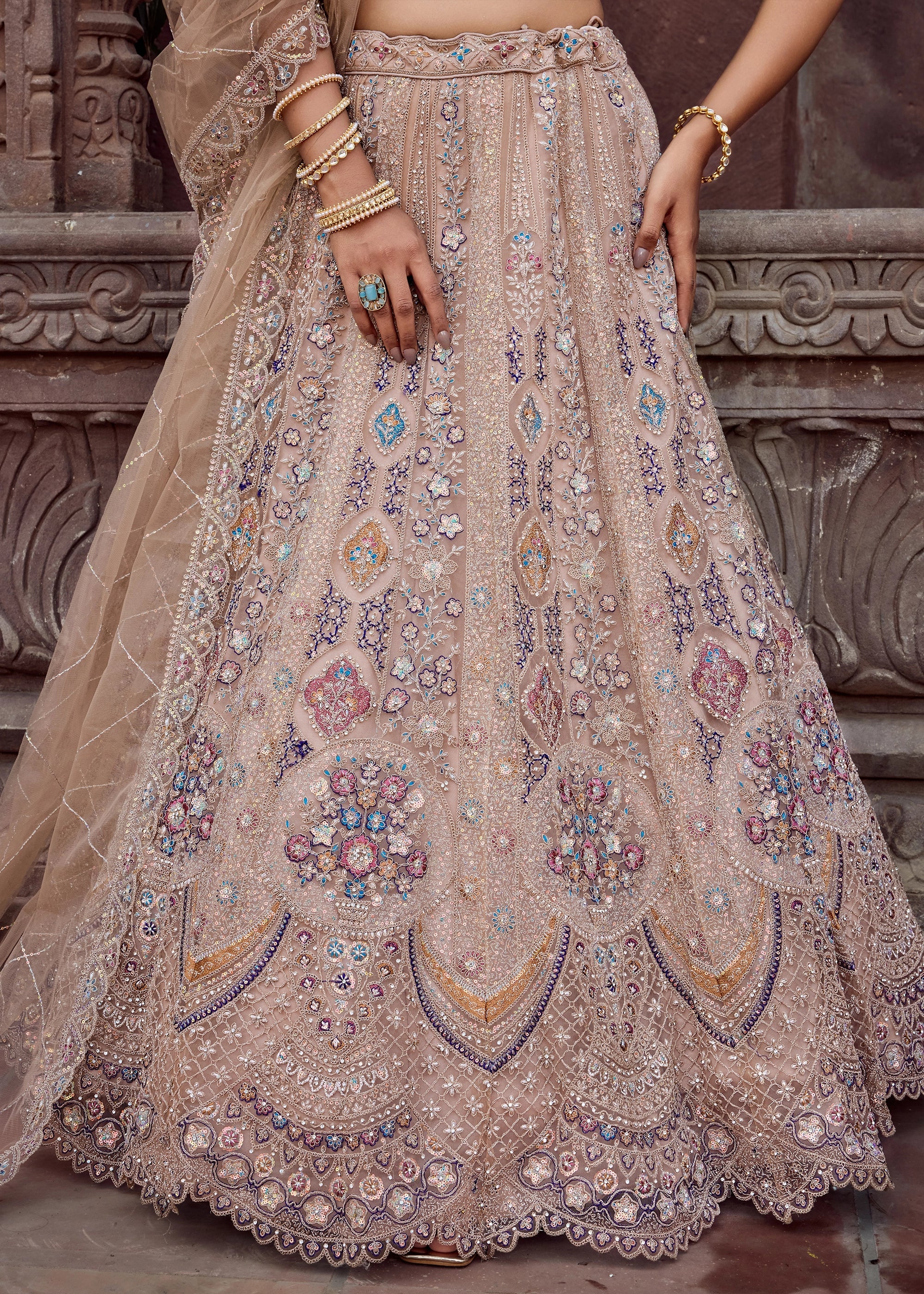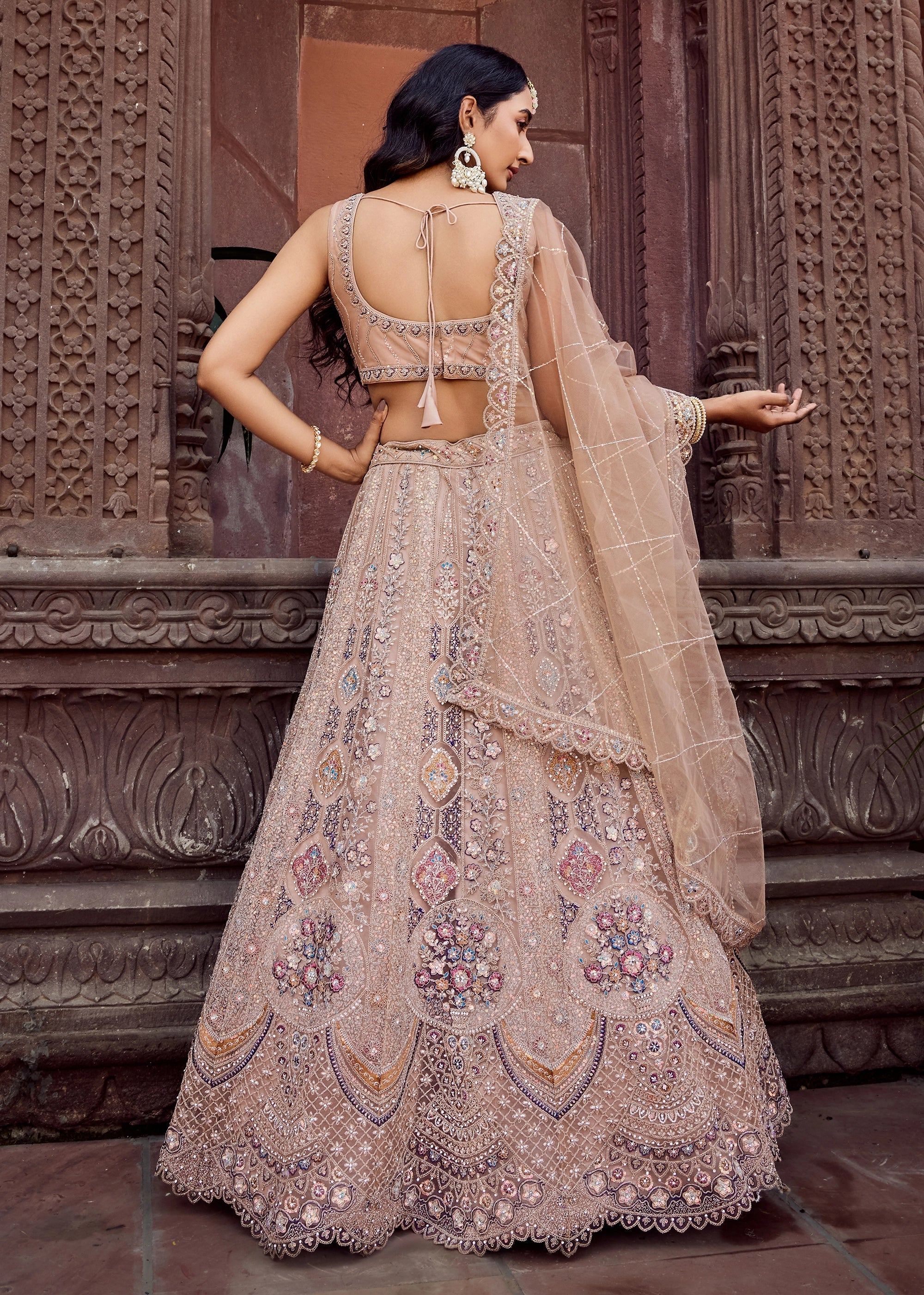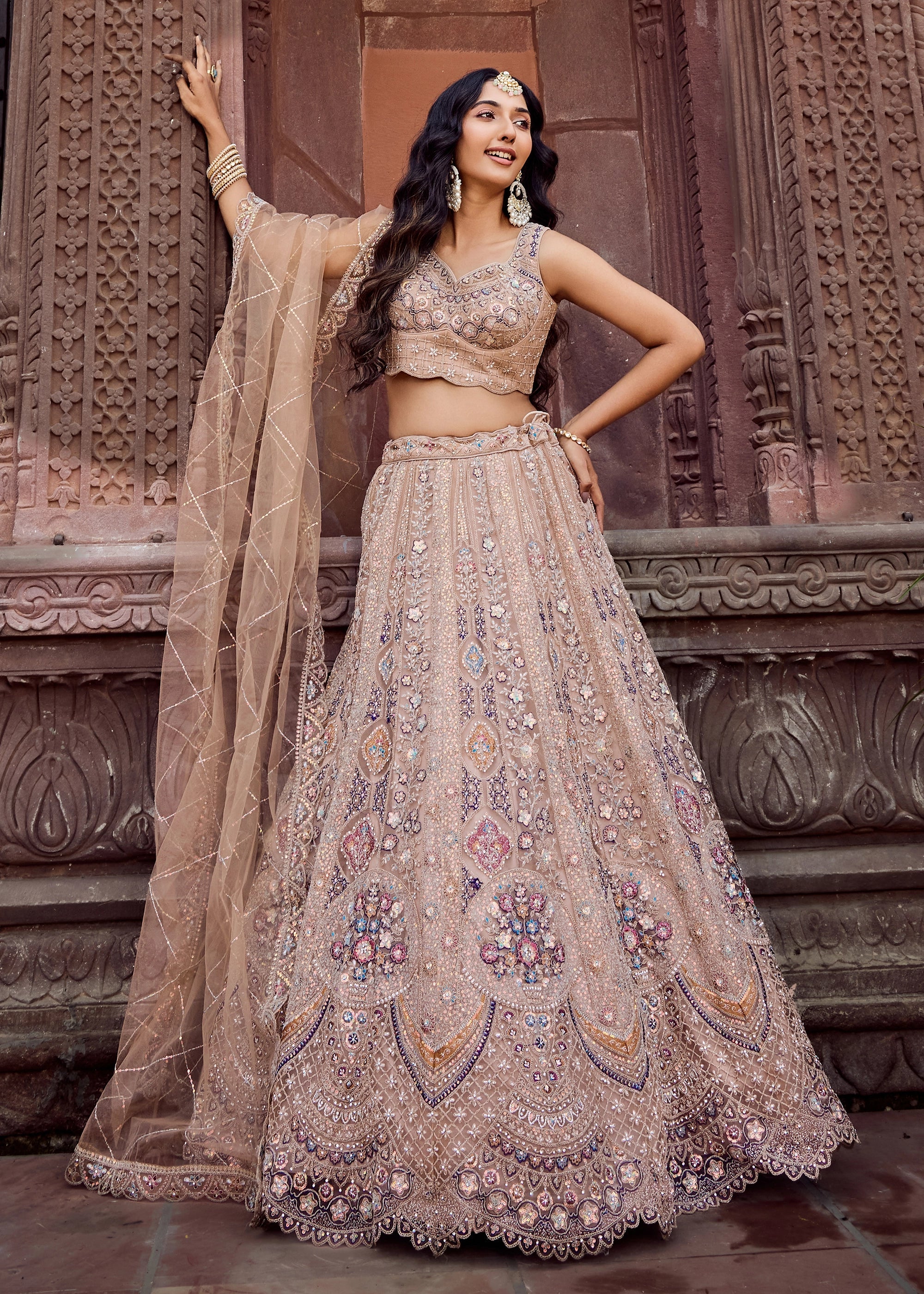 This net lehenga features intricate sequins, stone, and thread embroidery work, suitable for weddings.  Lehenga Details : Fabric: Net (Lehenga,...
