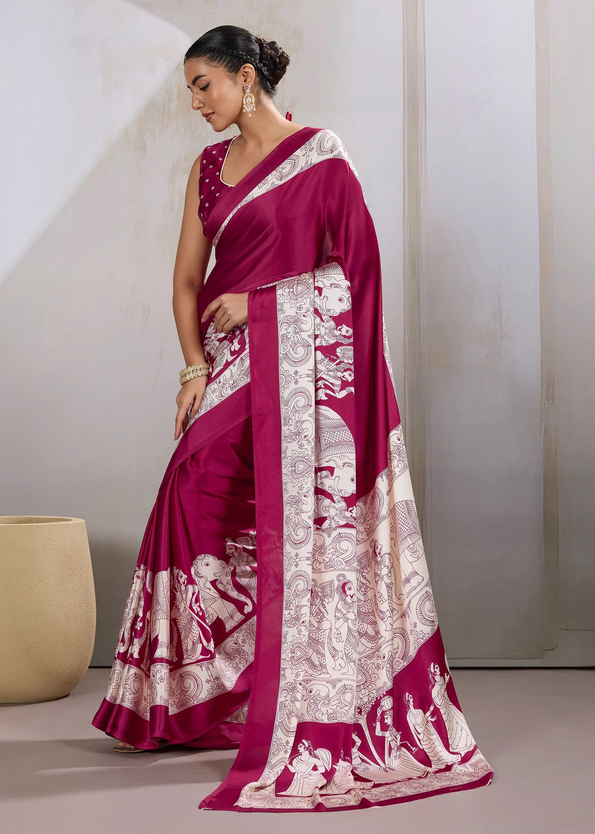 Its sleek, opulent fabric provides a sophisticated base for the captivating Ajrakh printed pallu and blouse, infusing traditional charm into a modern design. Whether it's a festive gathering, a formal event, or a special evening out, this saree is designed to make you feel effortlessly elegant and uniquely beautiful.