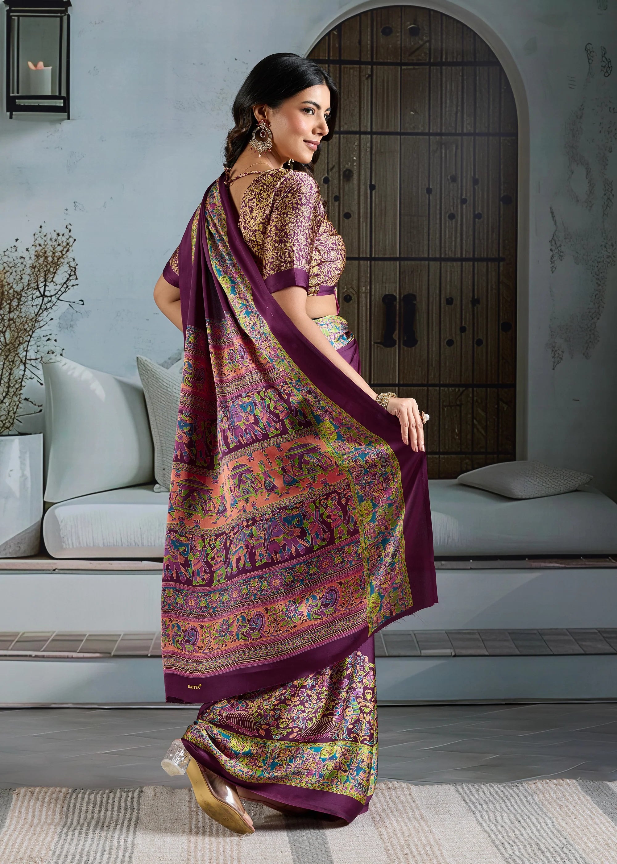 Its sleek, opulent fabric provides a sophisticated base for the captivating Ajrakh printed pallu and blouse, infusing traditional charm into a modern design. Whether it's a festive gathering, a formal event, or a special evening out, this saree is designed to make you feel effortlessly elegant and uniquely beautiful.