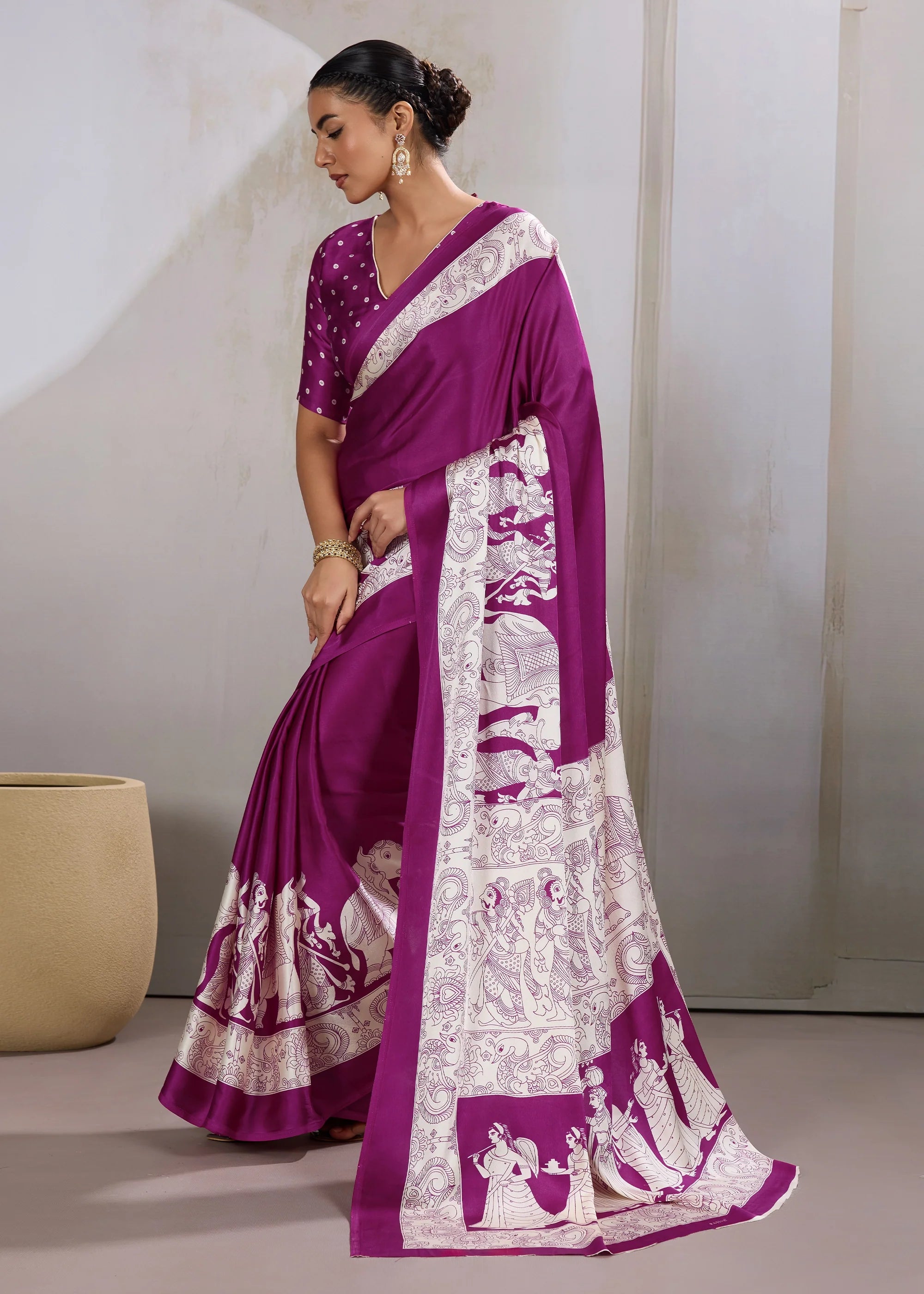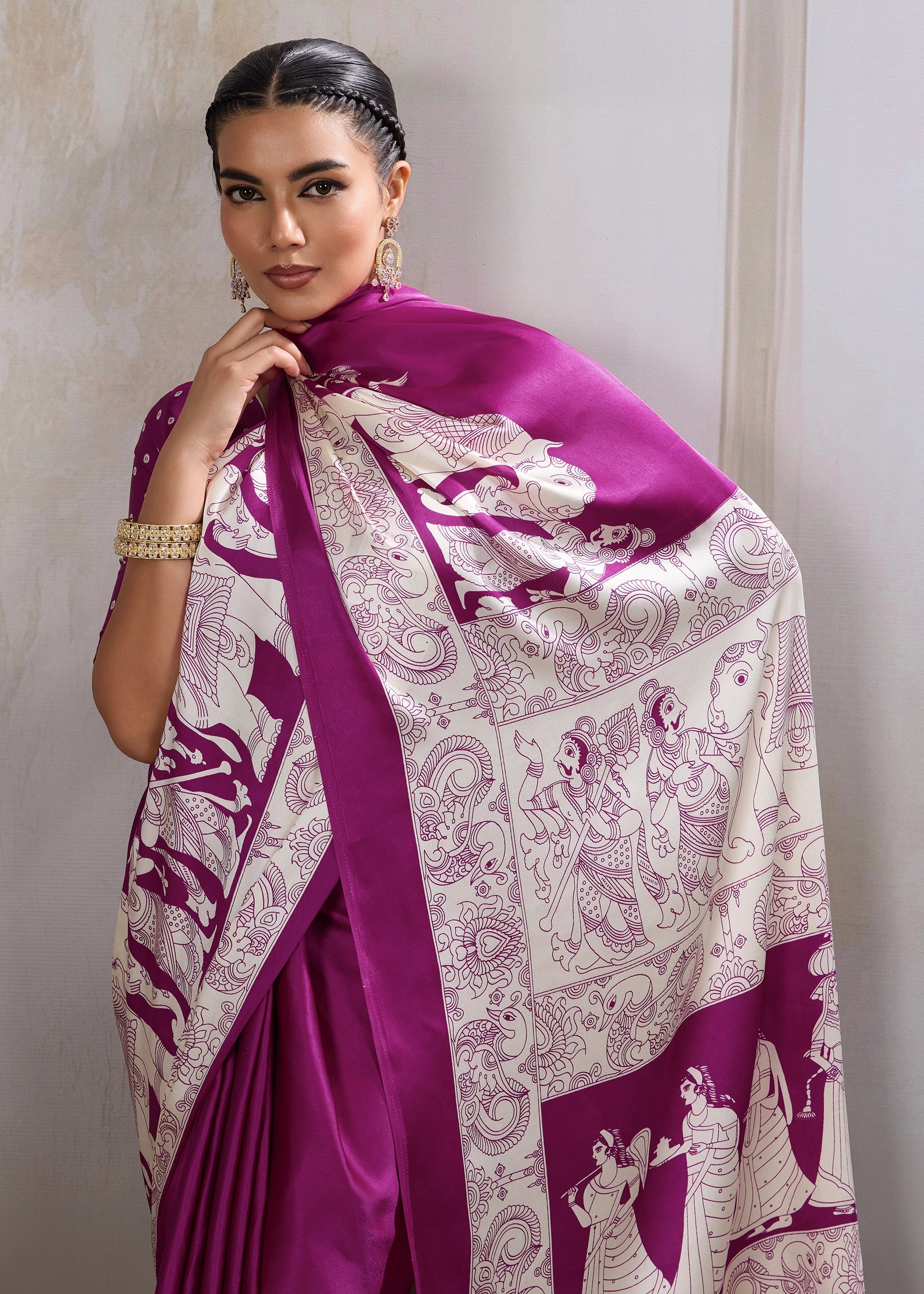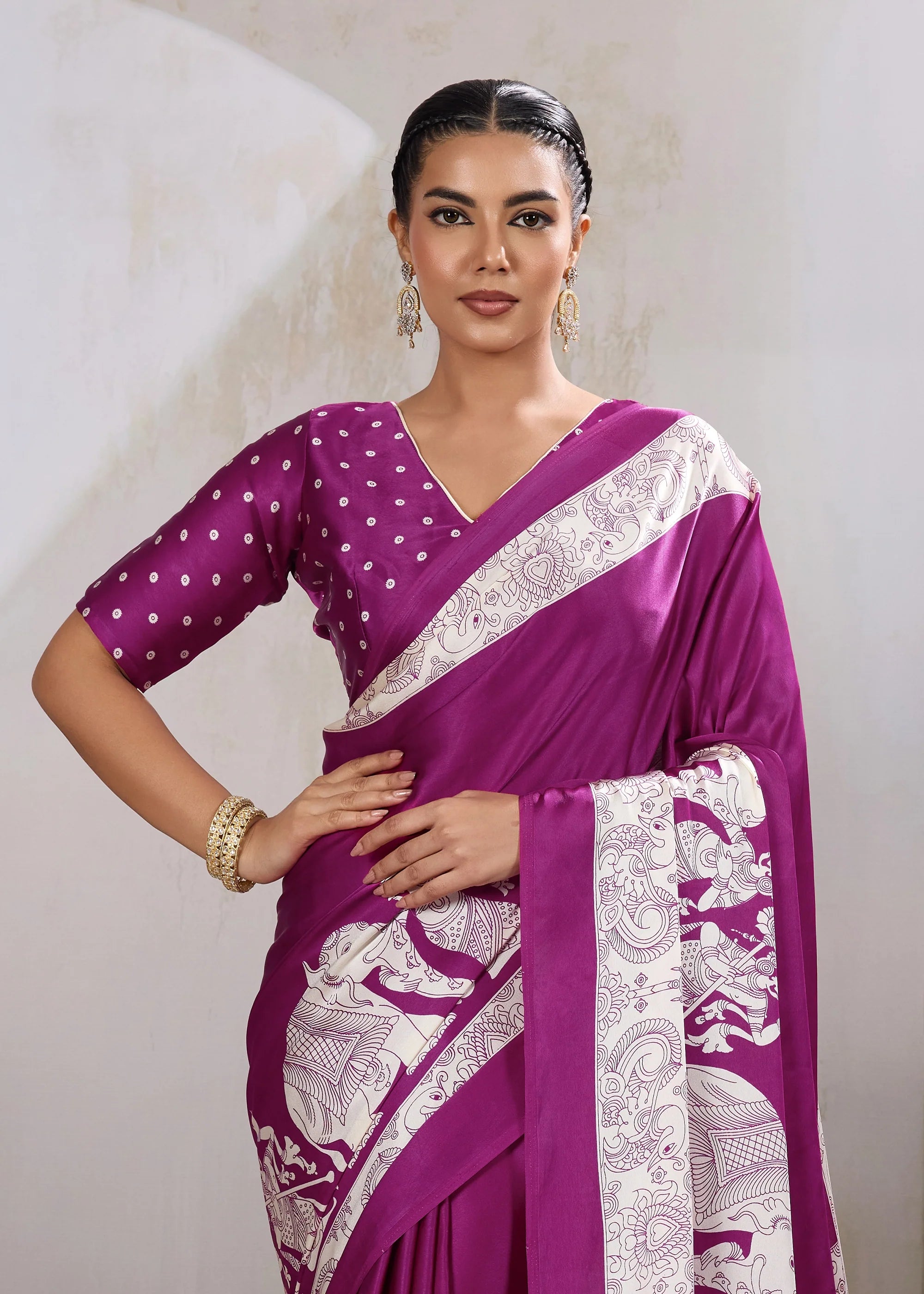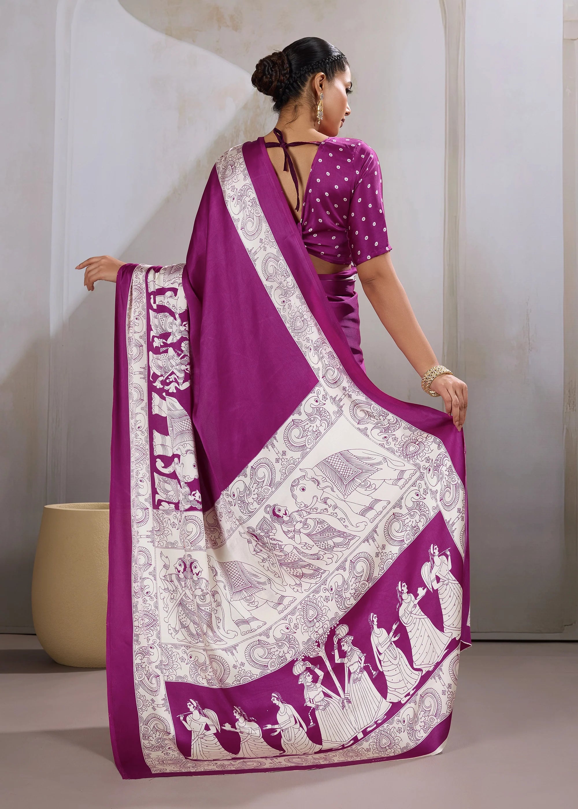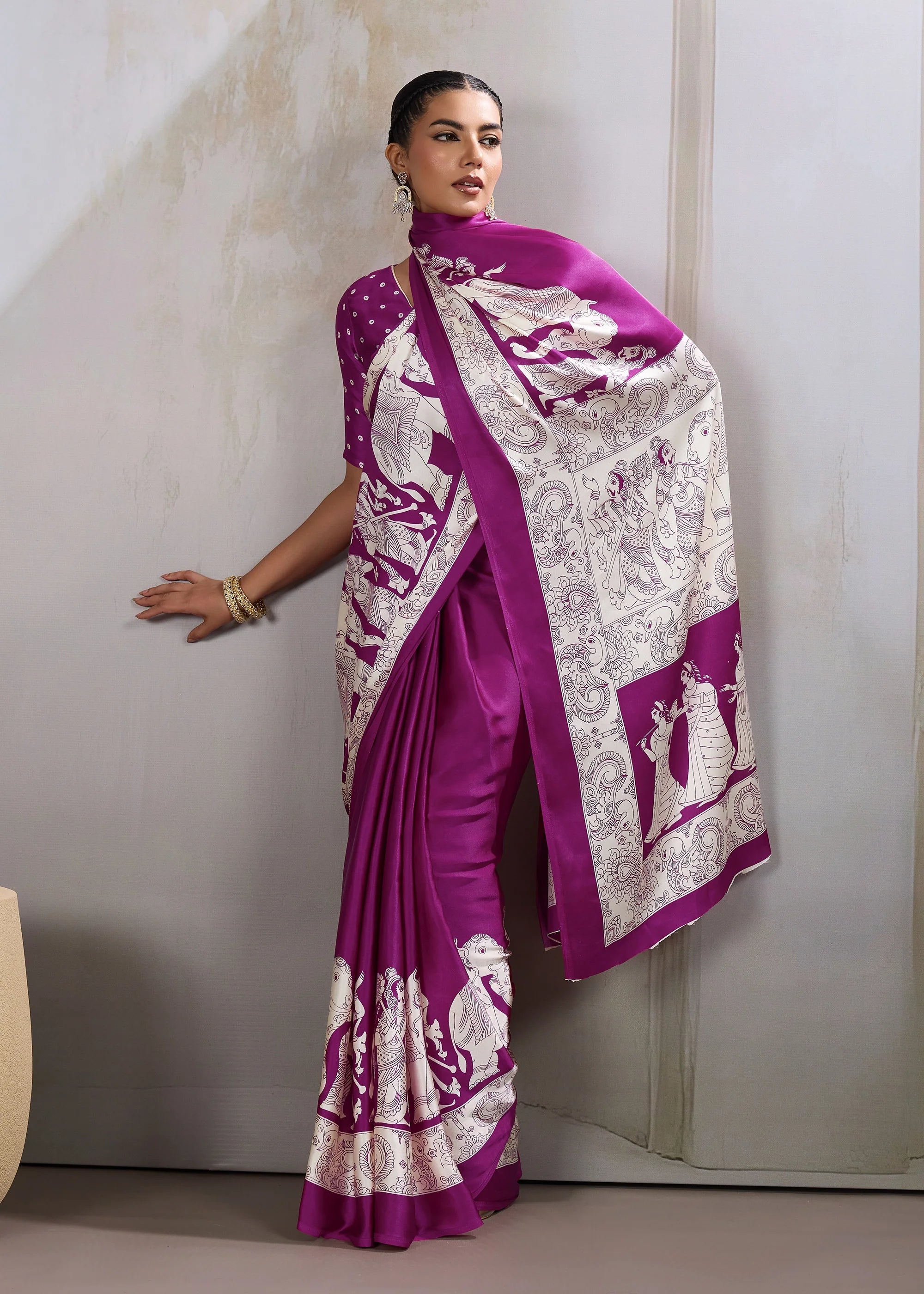 Its sleek, opulent fabric provides a sophisticated base for the captivating Ajrakh printed pallu and blouse, infusing traditional charm into a modern design. Whether it's a festive gathering, a formal event, or a special evening out, this saree is designed to make you feel effortlessly elegant and uniquely beautiful.
