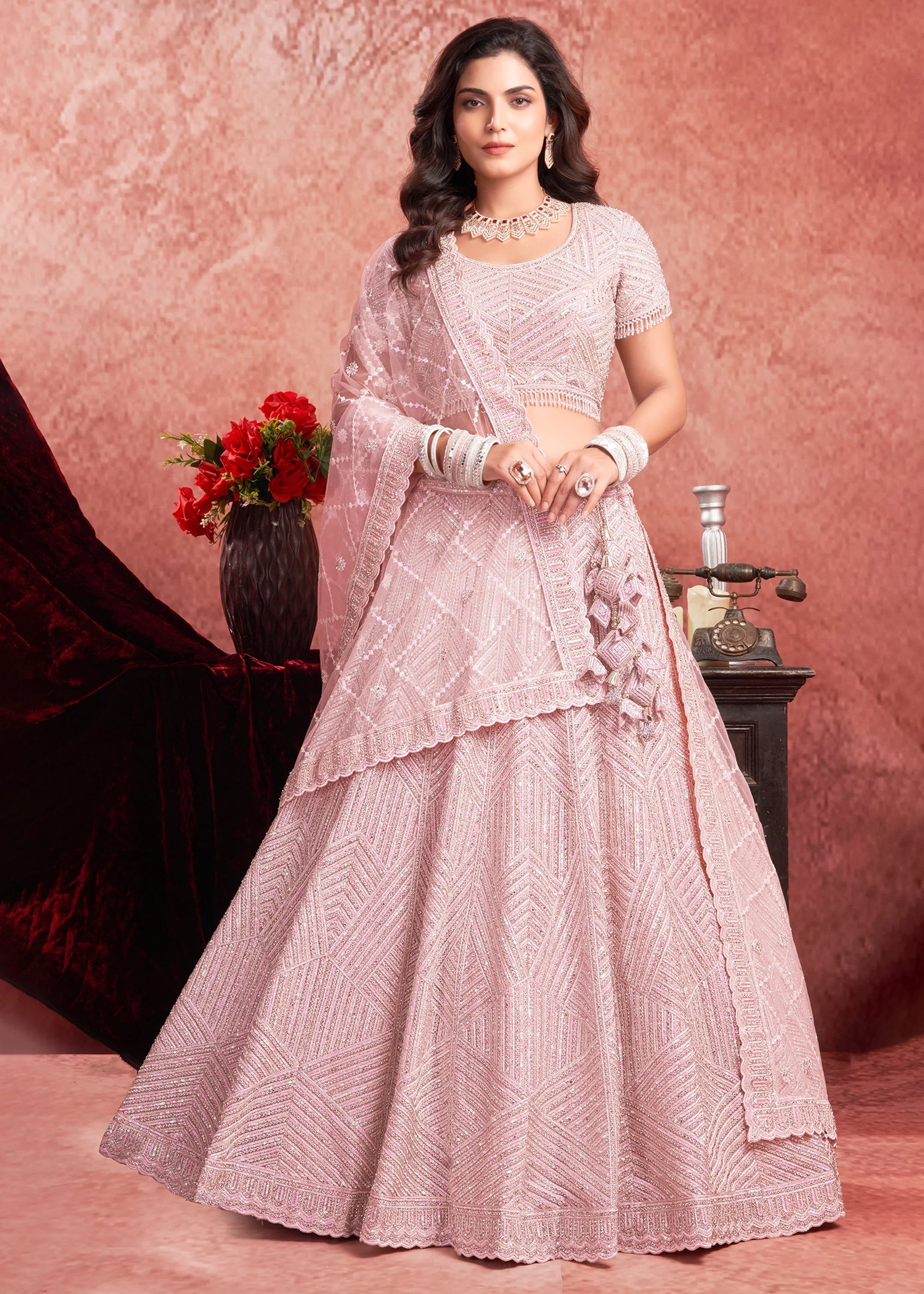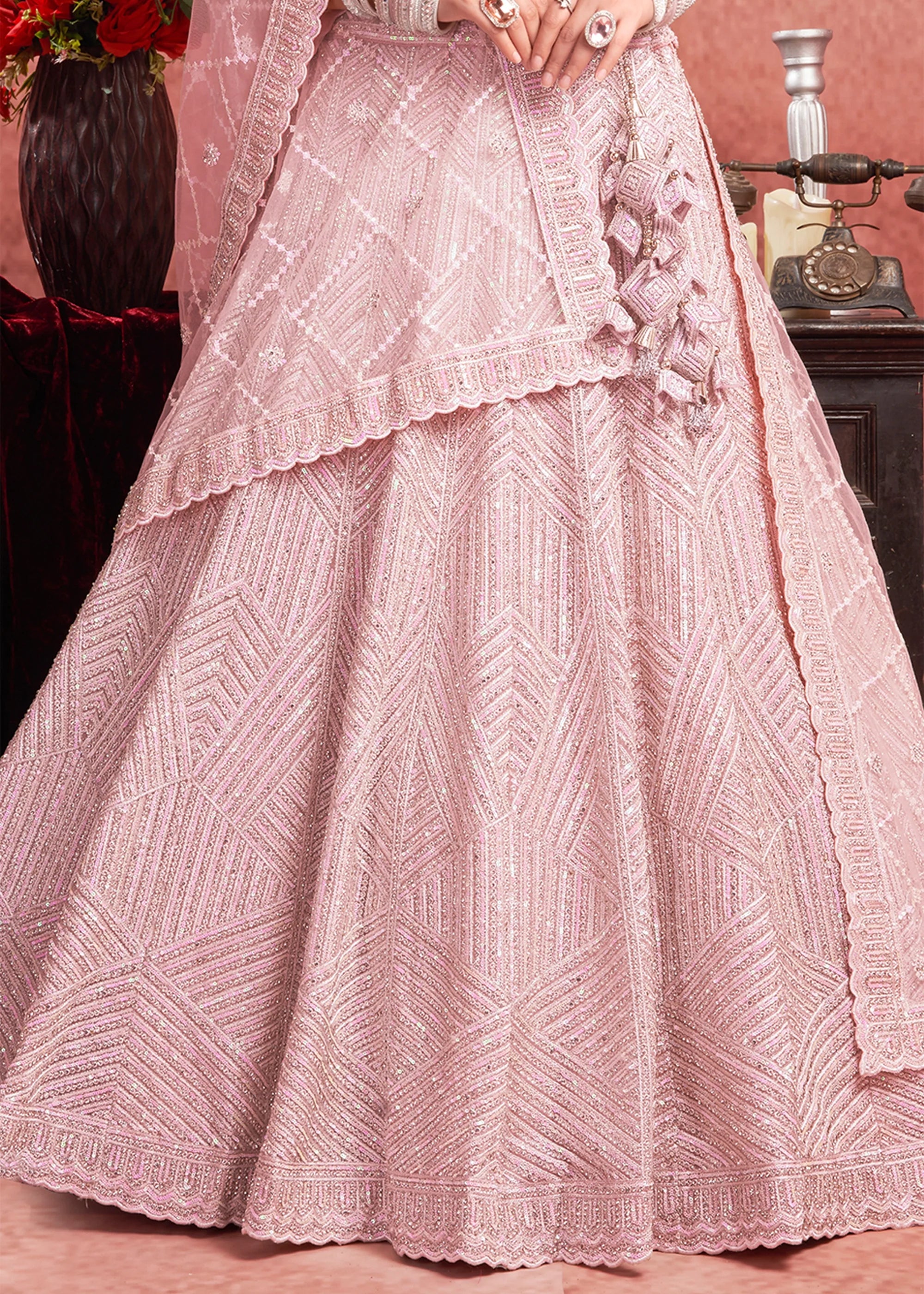 Embrace ethereal elegance with this exquisite premium net lehenga choli set. Featuring meticulous zarkan and mirror handwork, it is perfect for weddings, engagements, or sangeet.