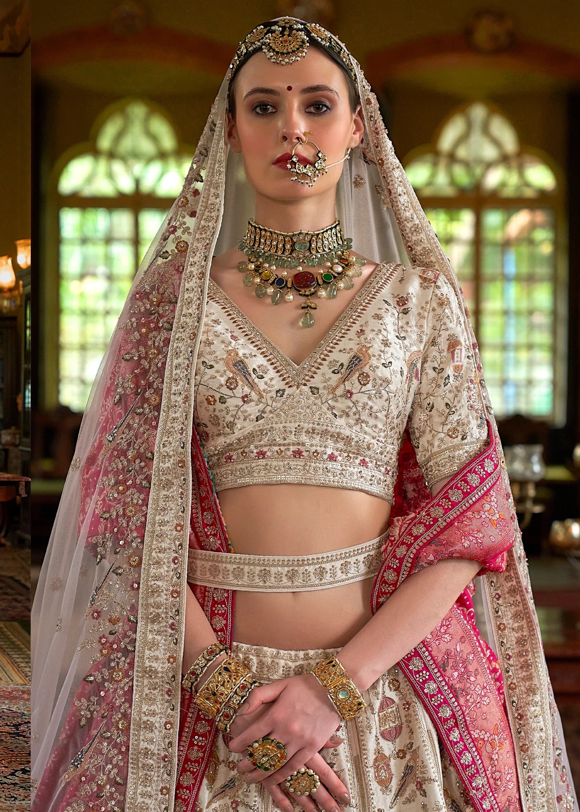This bridal lehenga is crafted from silk with intricate zari, sequins, and thread embroidery. The ensemble features a heavy flair, double...