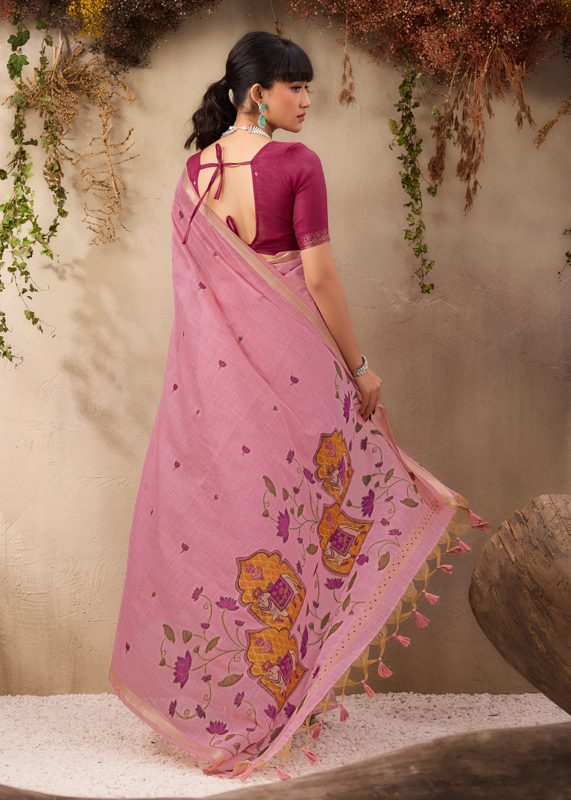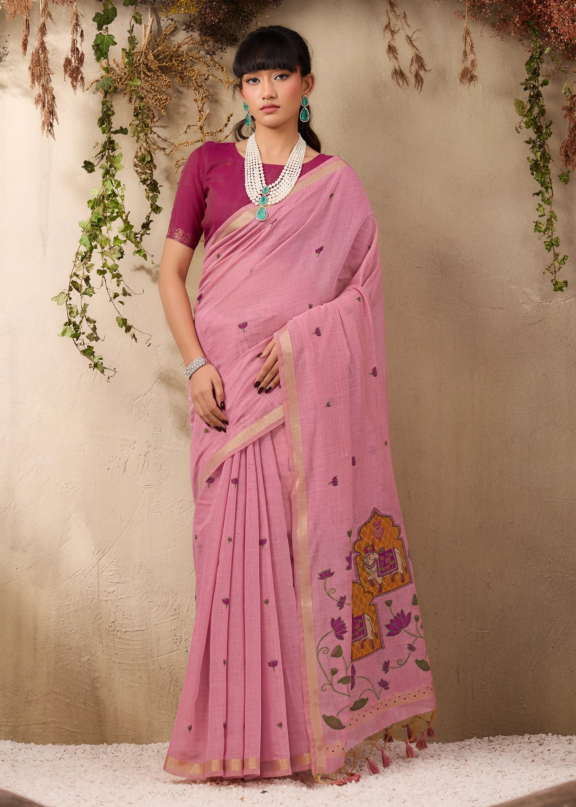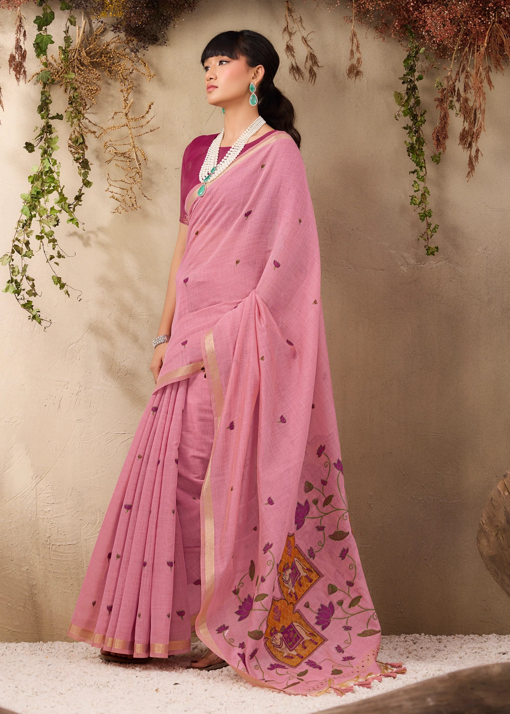 This exquisite saree features a beautiful blend of cotton and silk threads, expertly woven together to create a fabric that is both soft and lustrous. The cotton provides a comfortable drape, while the silk adds a subtle sheen and texture, giving the saree a regal and sophisticated appearance.