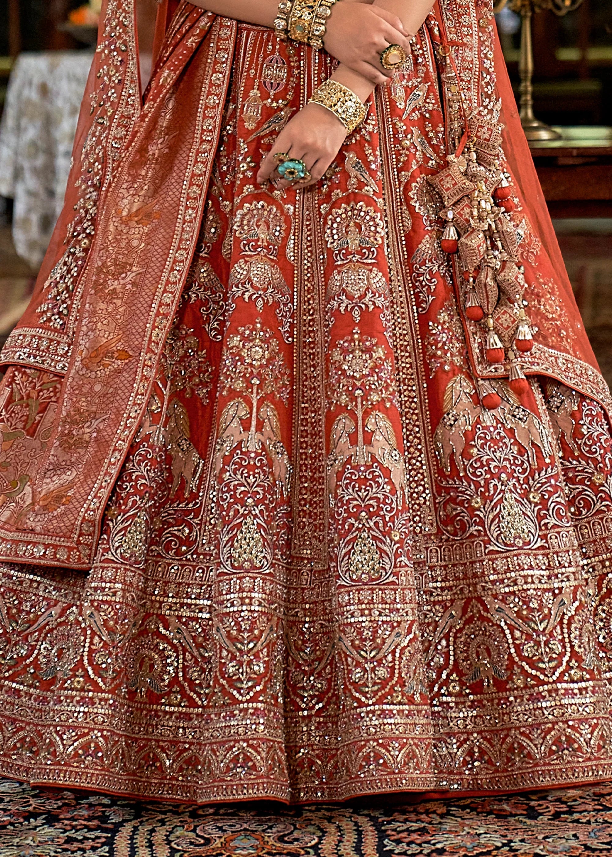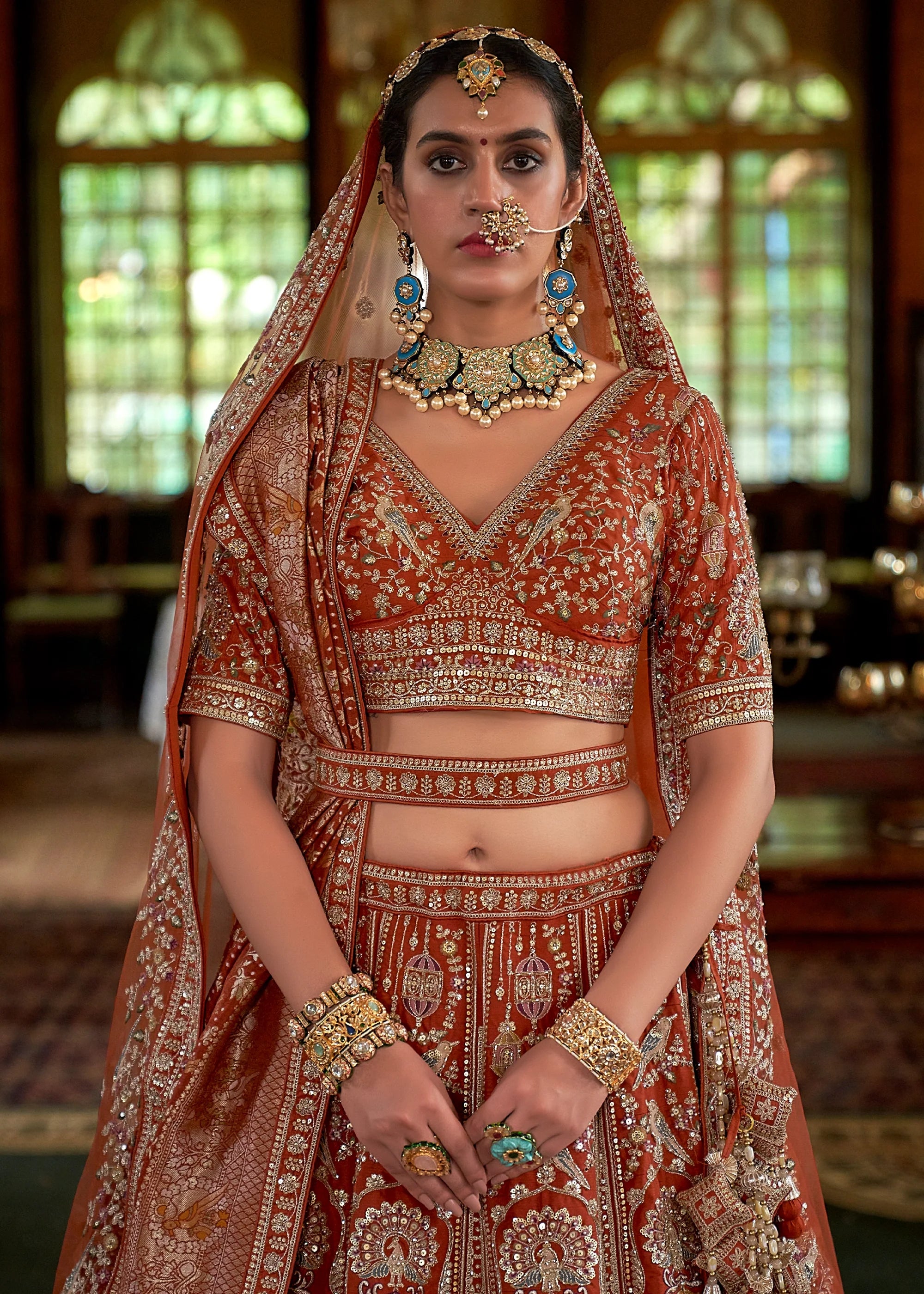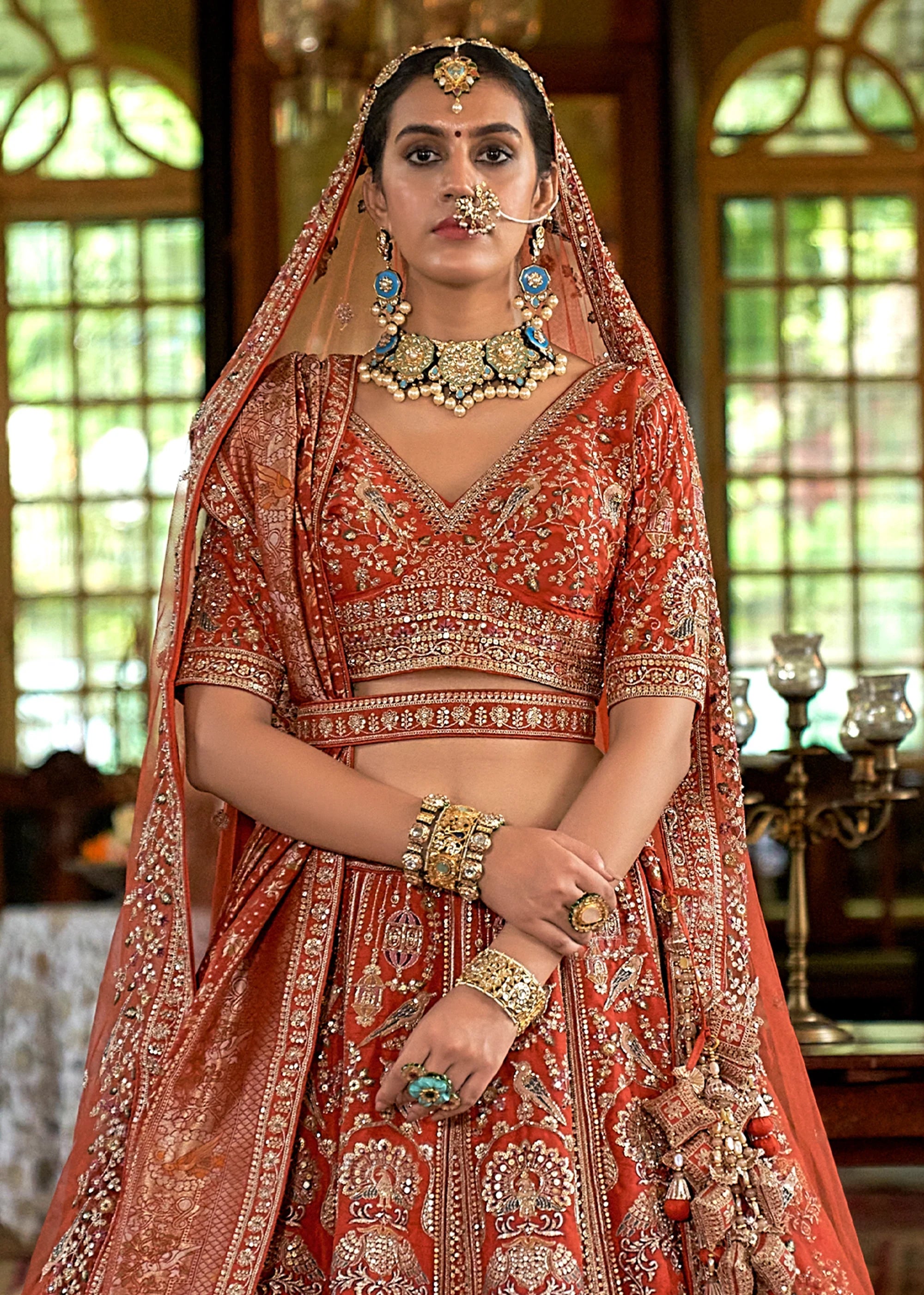 This bridal lehenga is crafted from silk with intricate zari, sequins, and thread embroidery. The ensemble features a heavy flair, double dupatta, and traditional motifs for a regal look.