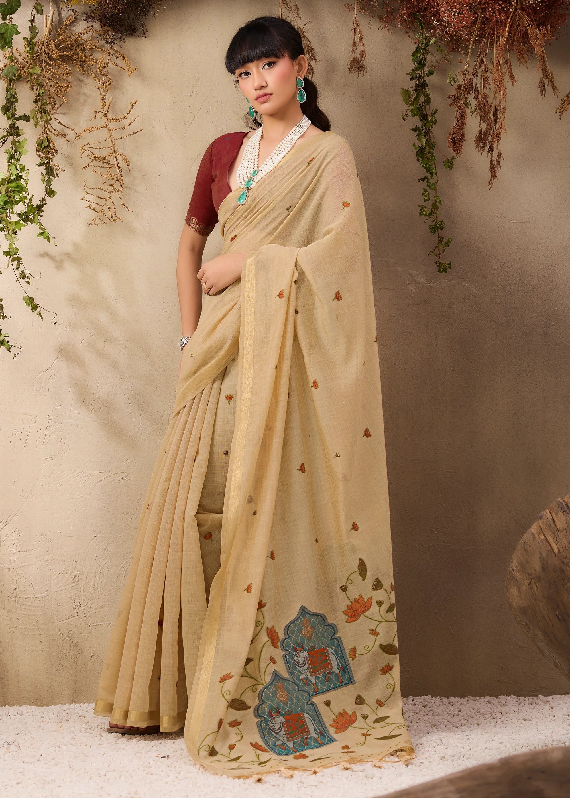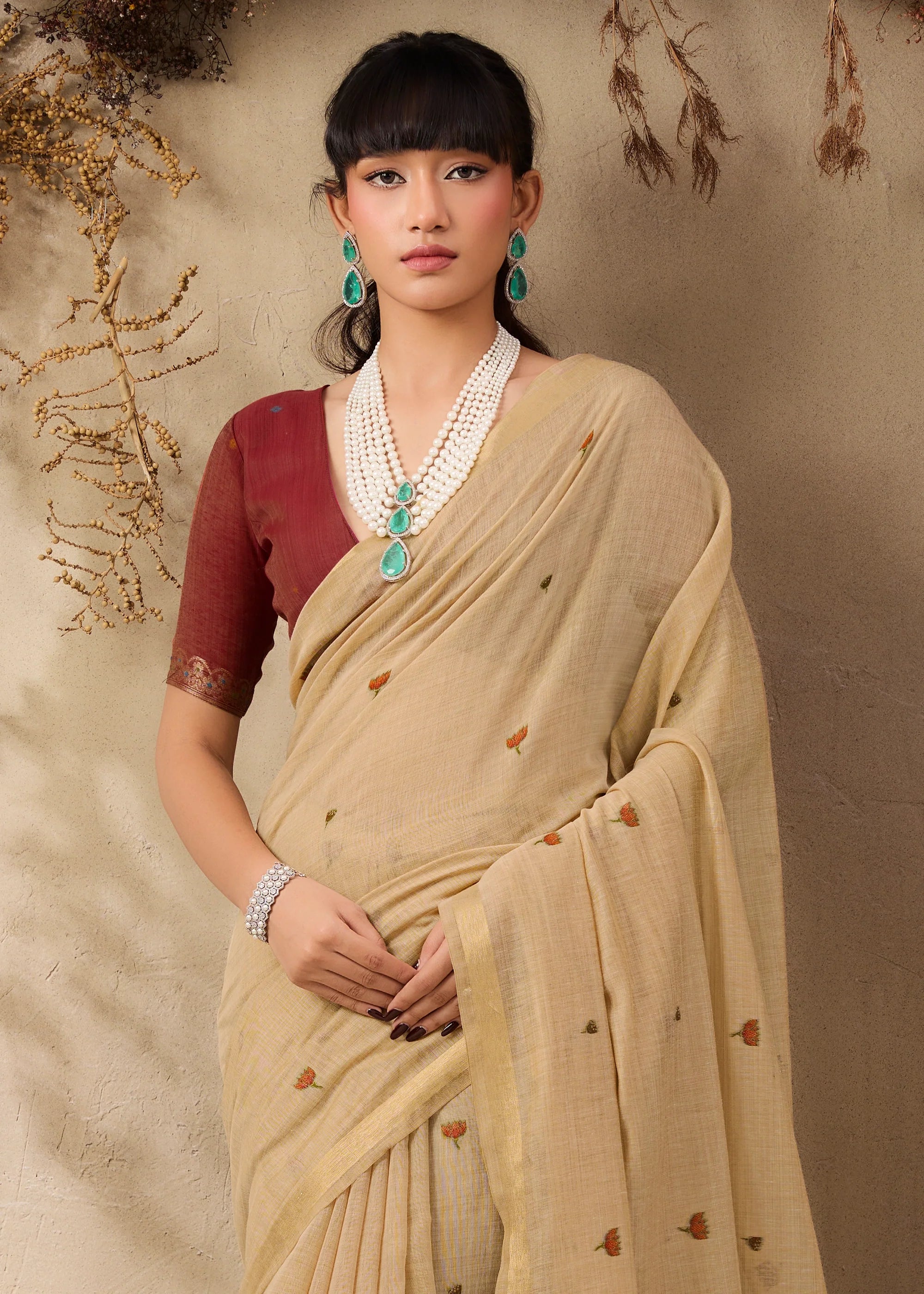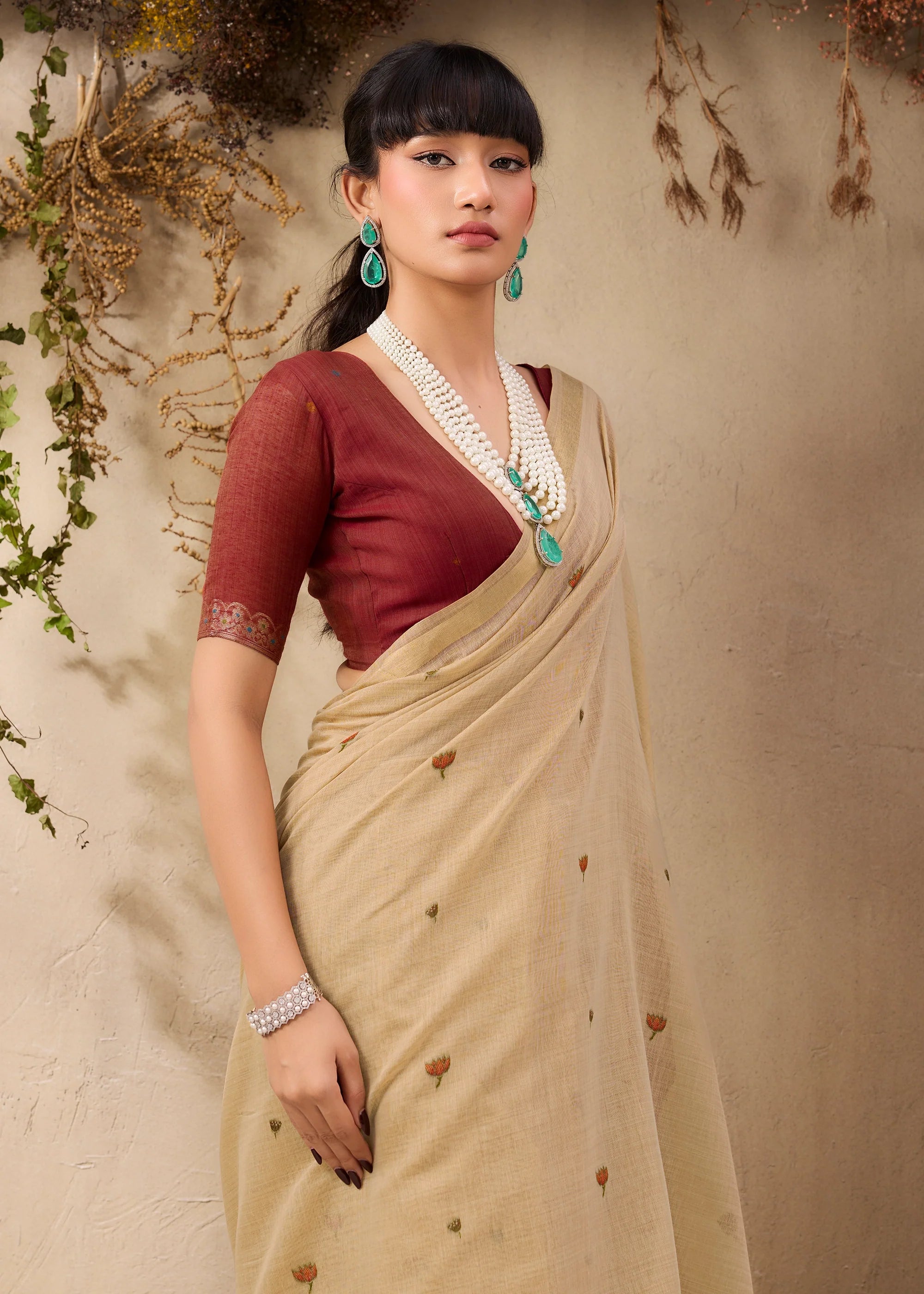 This exquisite saree features a beautiful blend of cotton and silk threads, expertly woven together to create a fabric that is both soft and lustrous. The cotton provides a comfortable drape, while the silk adds a subtle sheen and texture, giving the saree a regal and sophisticated appearance.