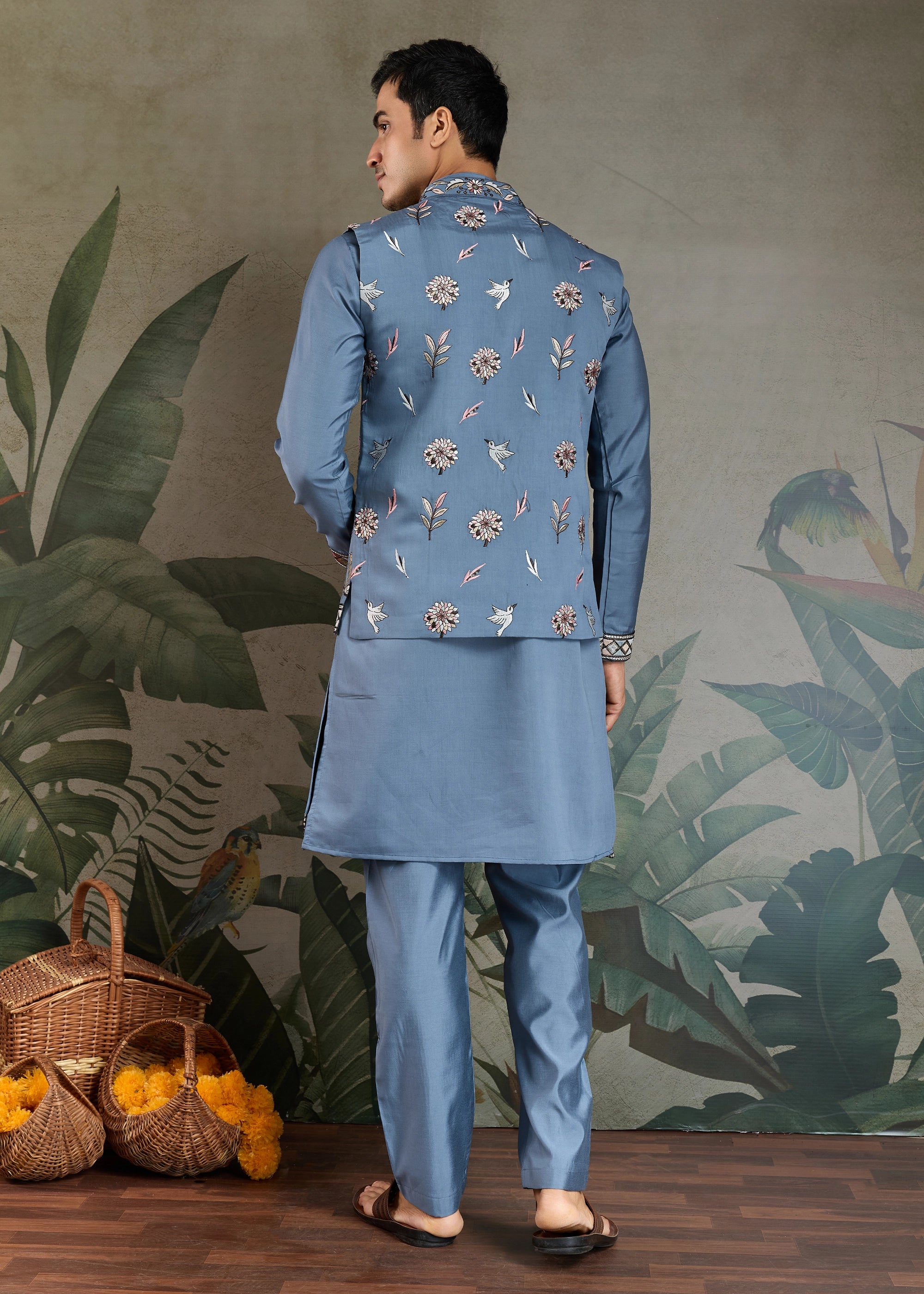 Niagara Blue Embroidered Stitched Kurta Set With Jacket